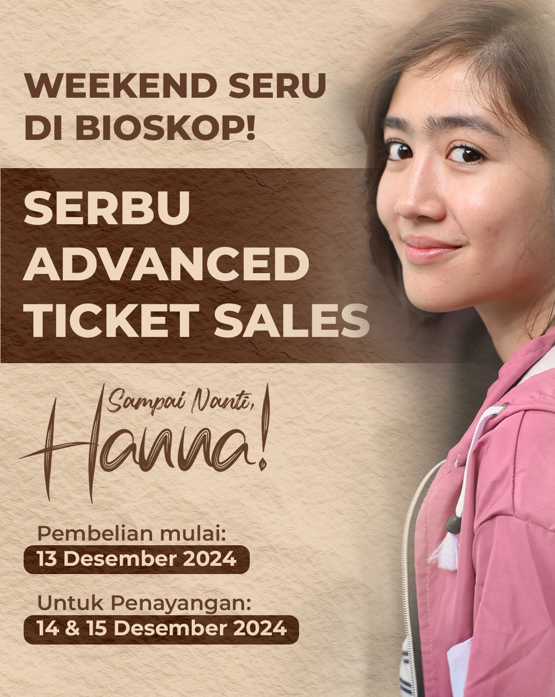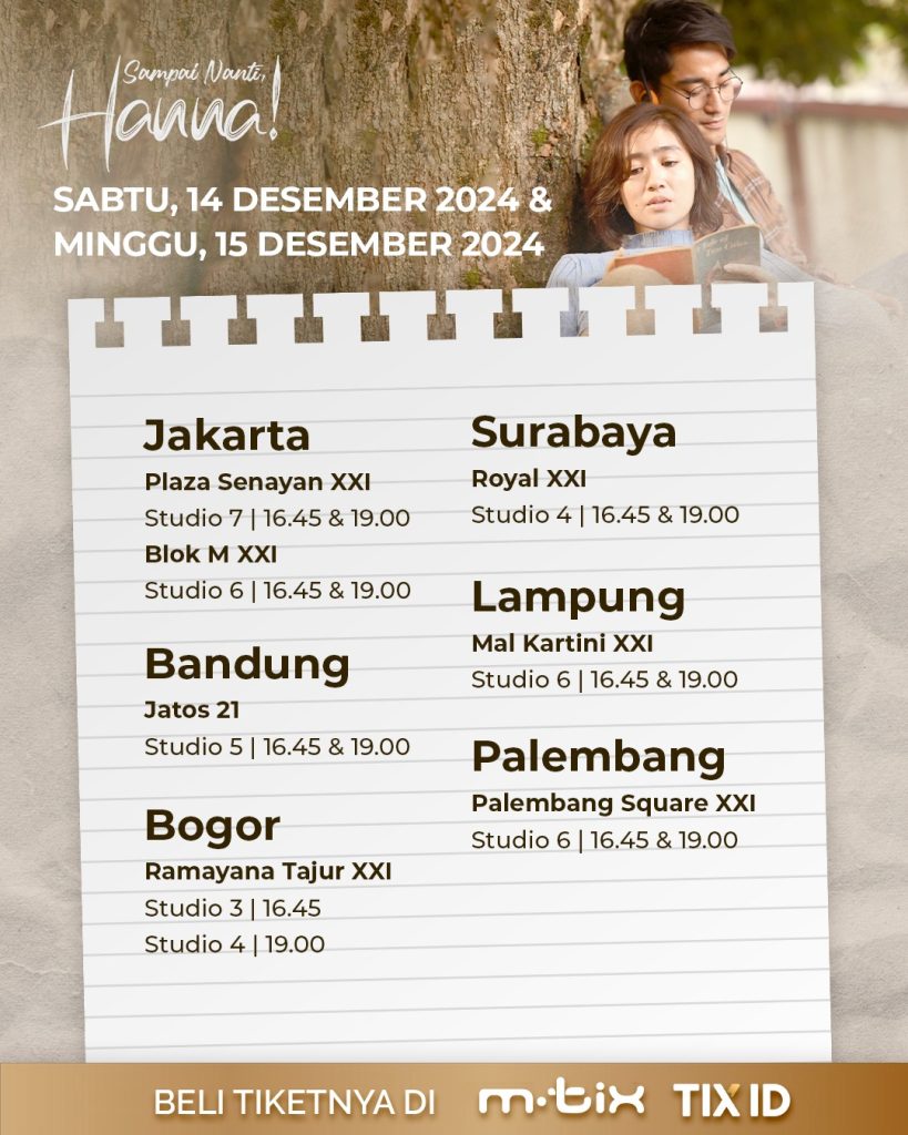 Jangan lewatkan kesempatan menyaksikan Sampai Nanti, Hanna! pada penayangan spesial akhir pekan ini. Pesan tiket Anda sekarang melalui platform ATS dan pastikan Anda menjadi bagian dari perjalanan Hanna yang penuh makna.