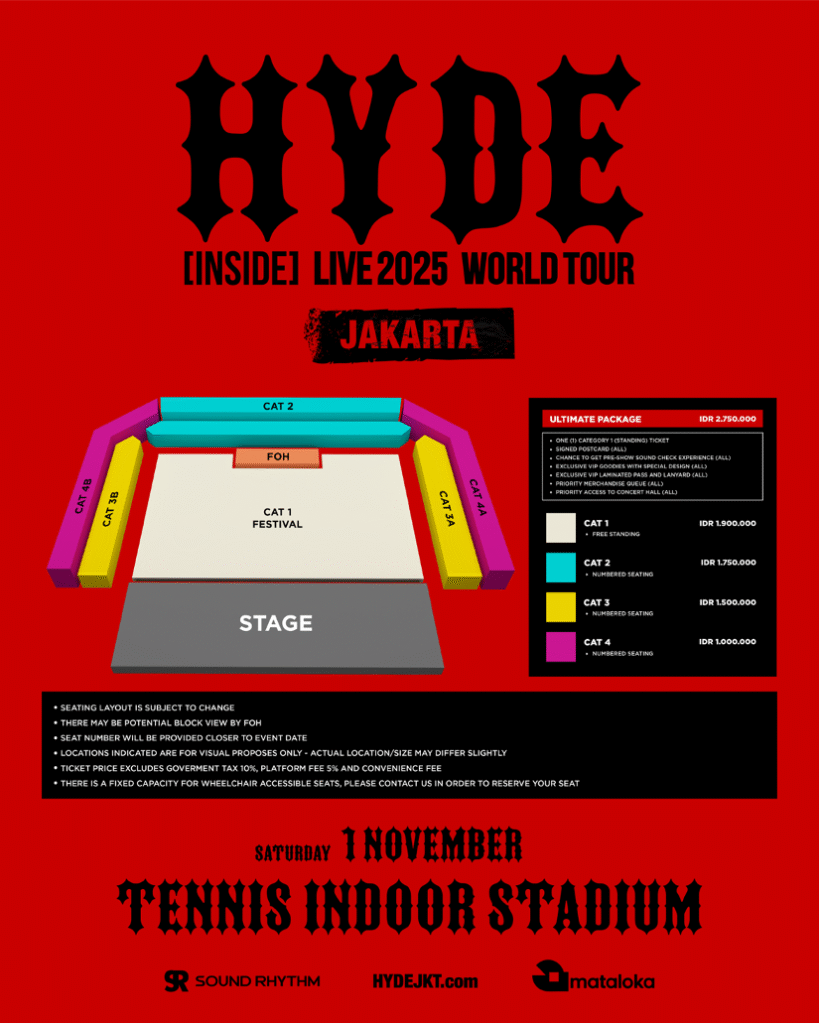 Diselenggarakan oleh promotor Sound Rhythm dan Mataloka, konser ini menjadi momen langka dan bersejarah bagi para penggemar HYDE di kawasan Asia. Dengan Indonesia sebagai satu-satunya negara Asia dalam daftar tur, para penggemar dari negara-negara tetangga dipastikan akan membanjiri Jakarta untuk menyaksikan pertunjukan penuh energi dan visual megah dari sang legenda.